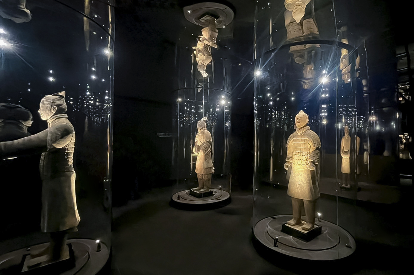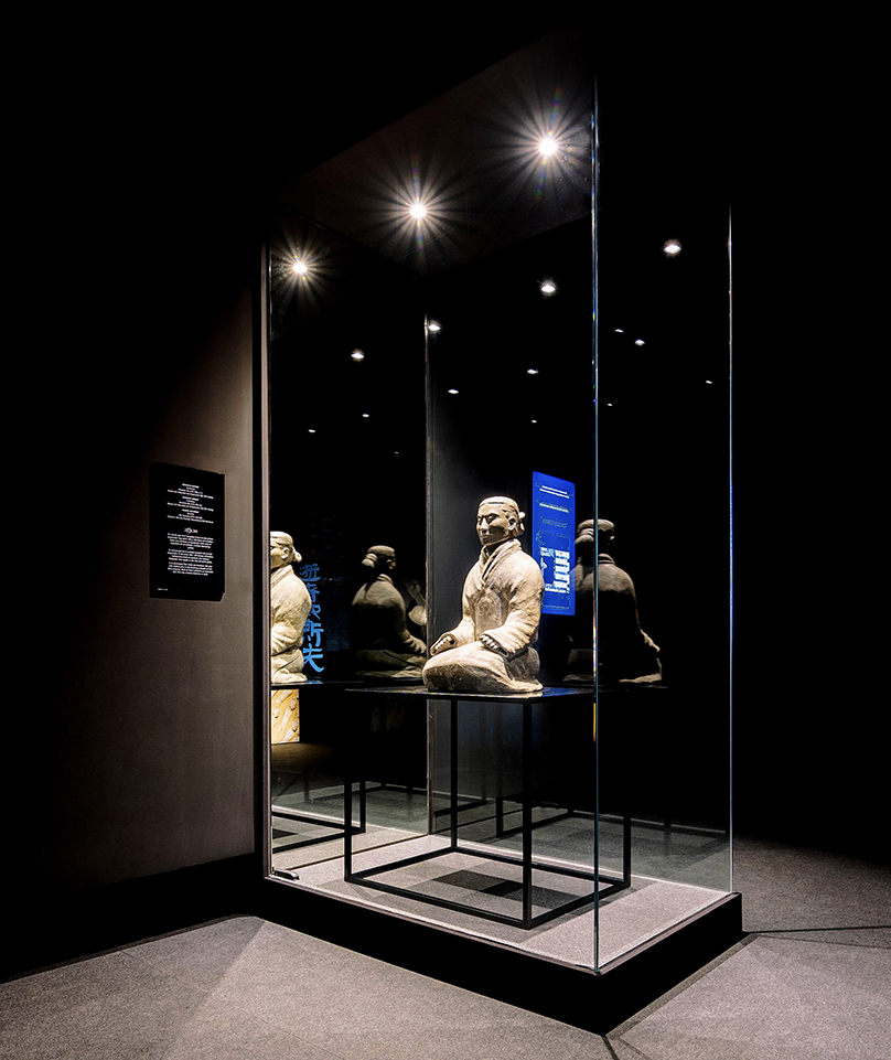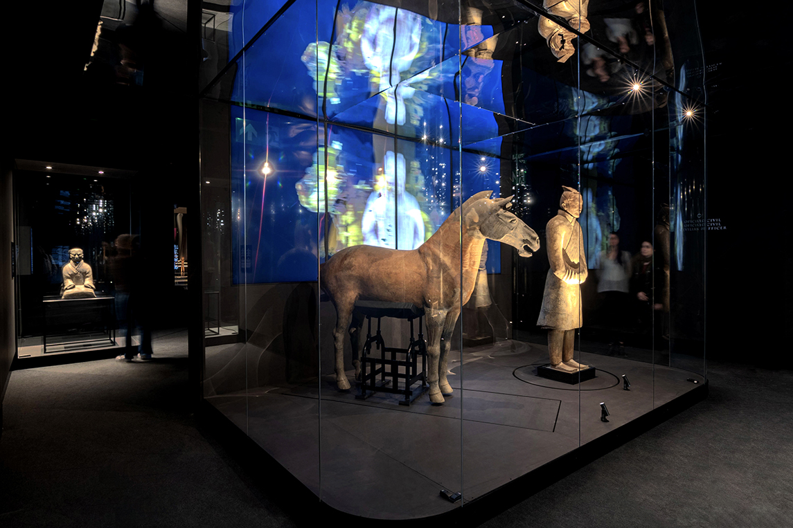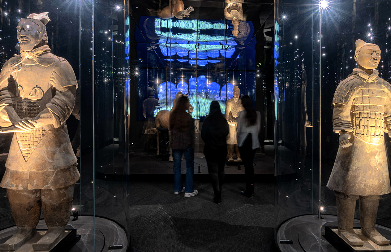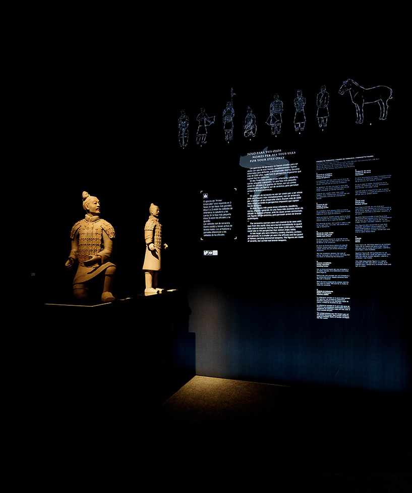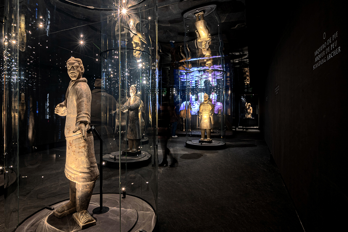 Sala 3 – «La Tumba del Emperador»: Guerreros dispuestos en vitrinas cilíndricas y un espejo en el techo multiplican la imagen de las esculturas, integrando al visitante en la escena. La luz cenital enfatiza la monumentalidad del conjunto, visto por primera vez en 360º.
