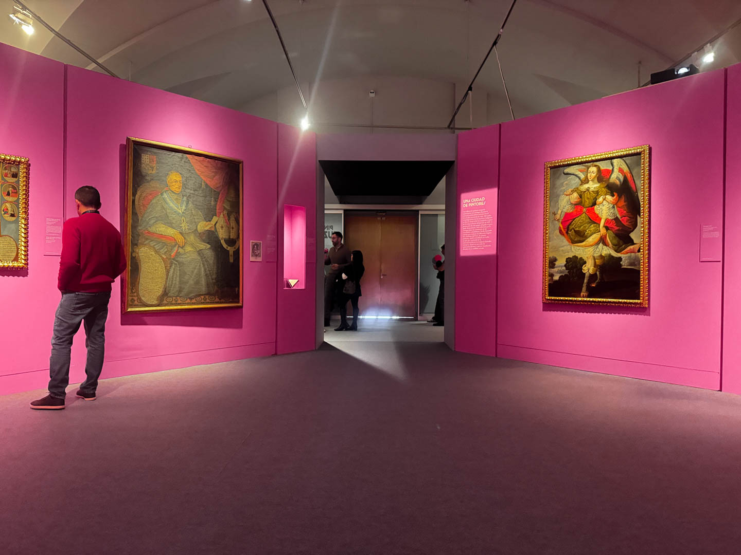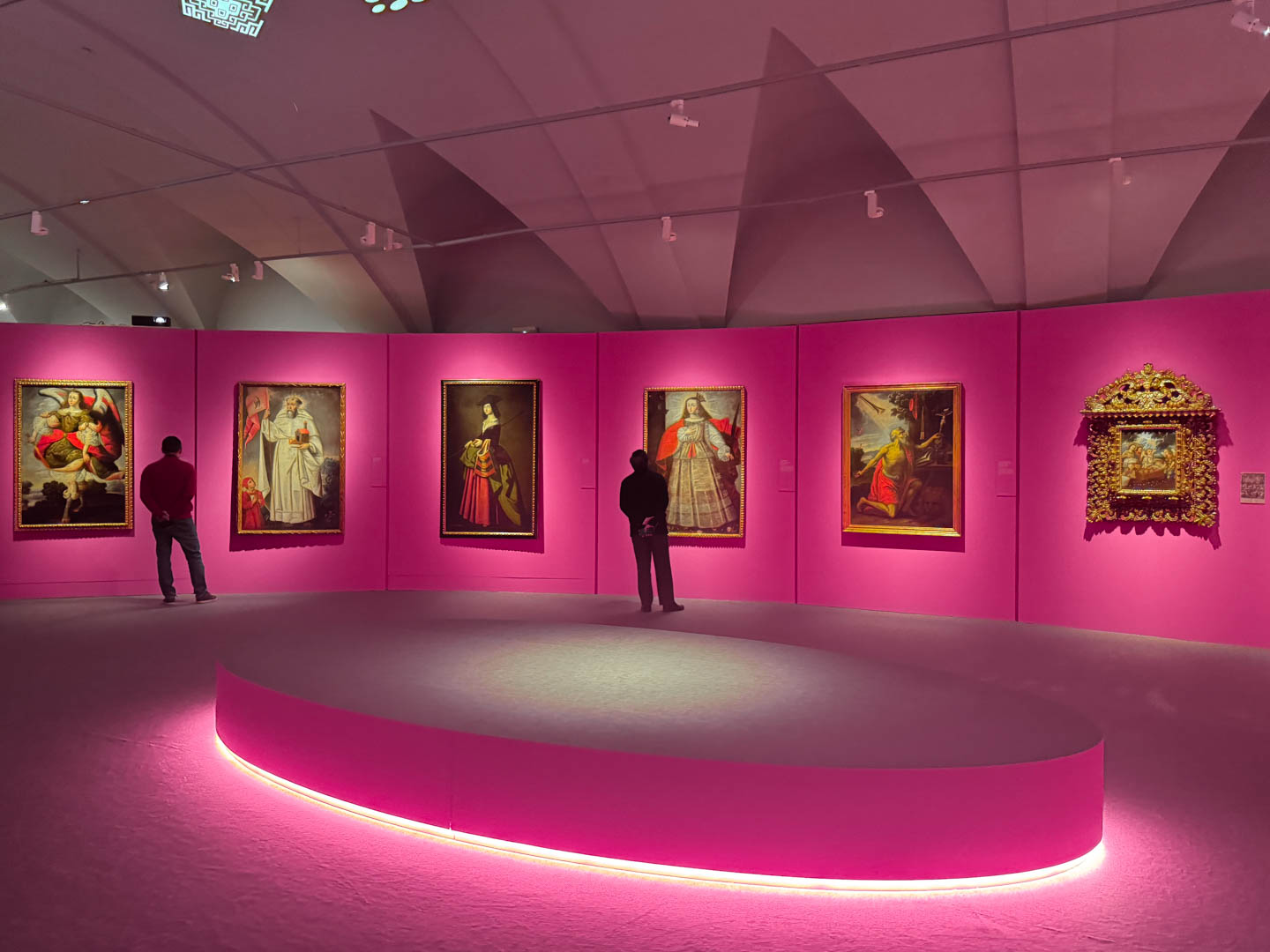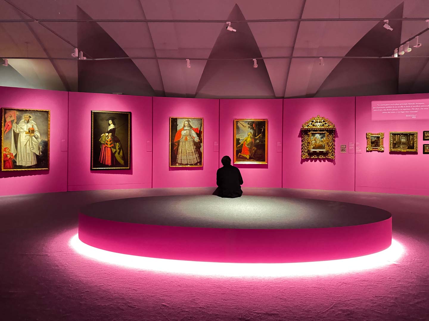 La museografía se organiza en tres salas que conforman un recorrido progresivo. La sala principal, de tono rosa, realza la intensidad de los cuadros y su fuerza narrativa. Las salas 1 y 2, blancas con luces doradas, dialogan con los colores de las obras. La paleta combina rosa, blanco, dorado y tonos oscuros, equilibrando y enfatizando la riqueza visual de la exposición.