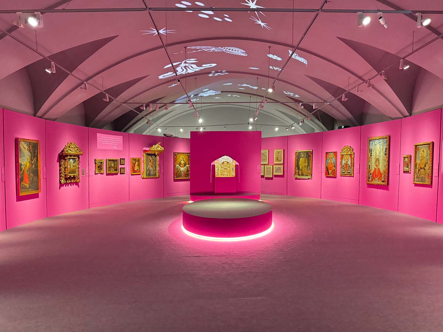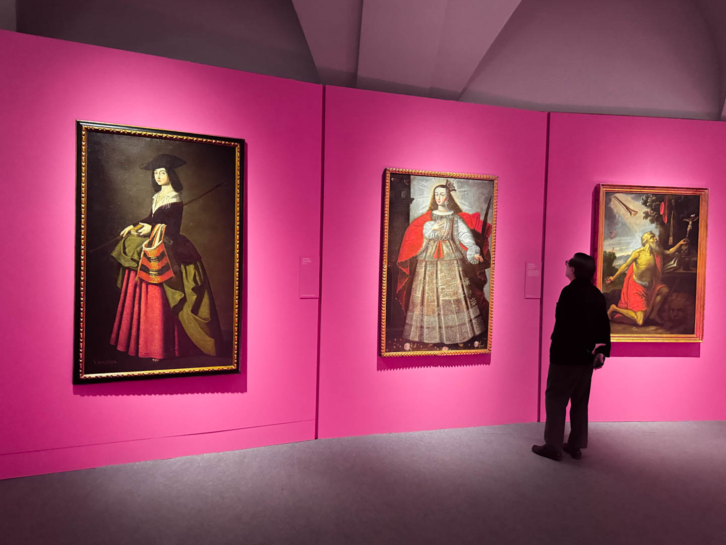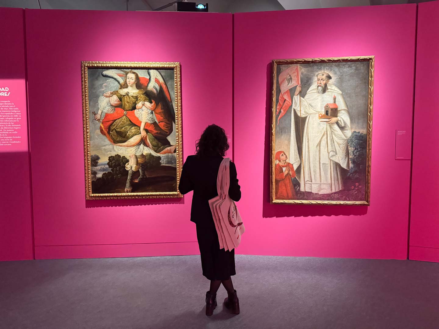 La museografía se organiza en tres salas que conforman un recorrido progresivo. La sala principal, de tono rosa, realza la intensidad de los cuadros y su fuerza narrativa. Las salas 1 y 2, blancas con luces doradas, dialogan con los colores de las obras. La paleta combina rosa, blanco, dorado y tonos oscuros, equilibrando y enfatizando la riqueza visual de la exposición.