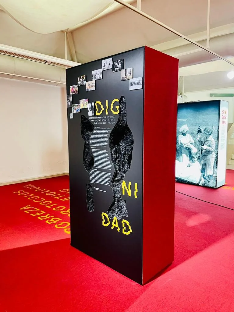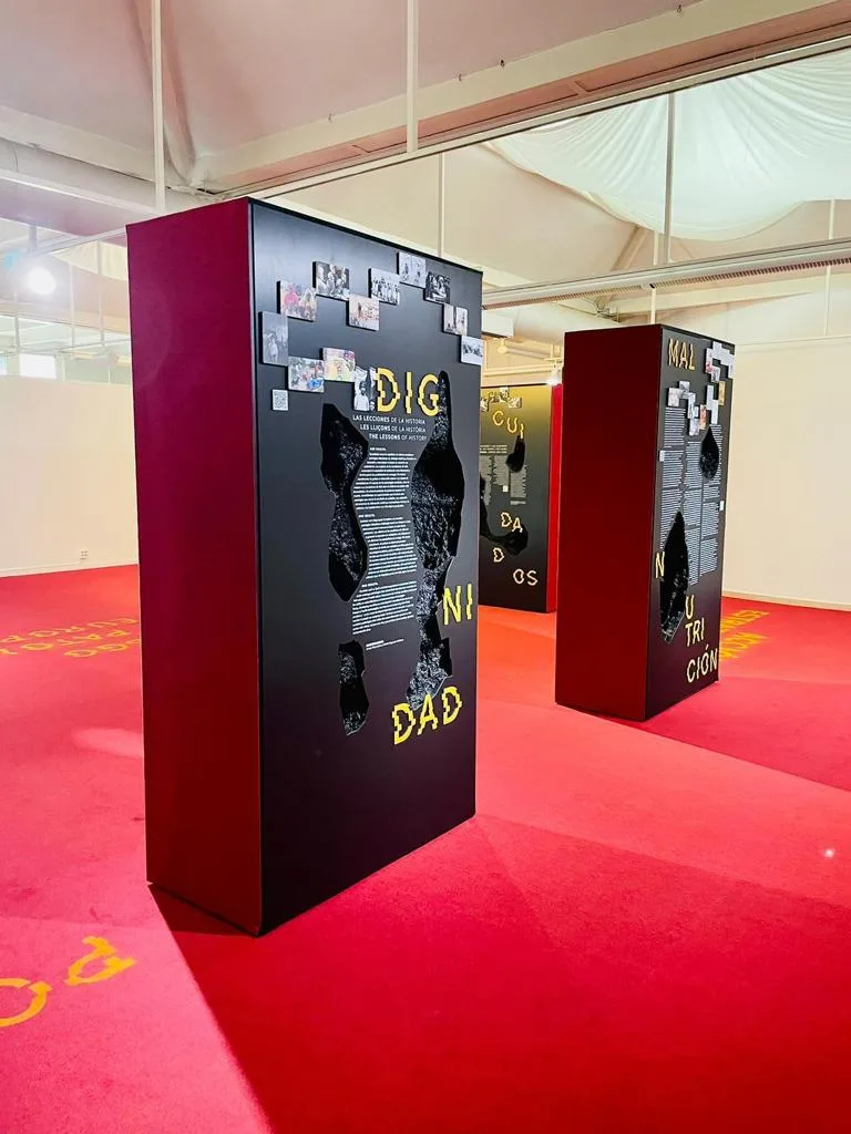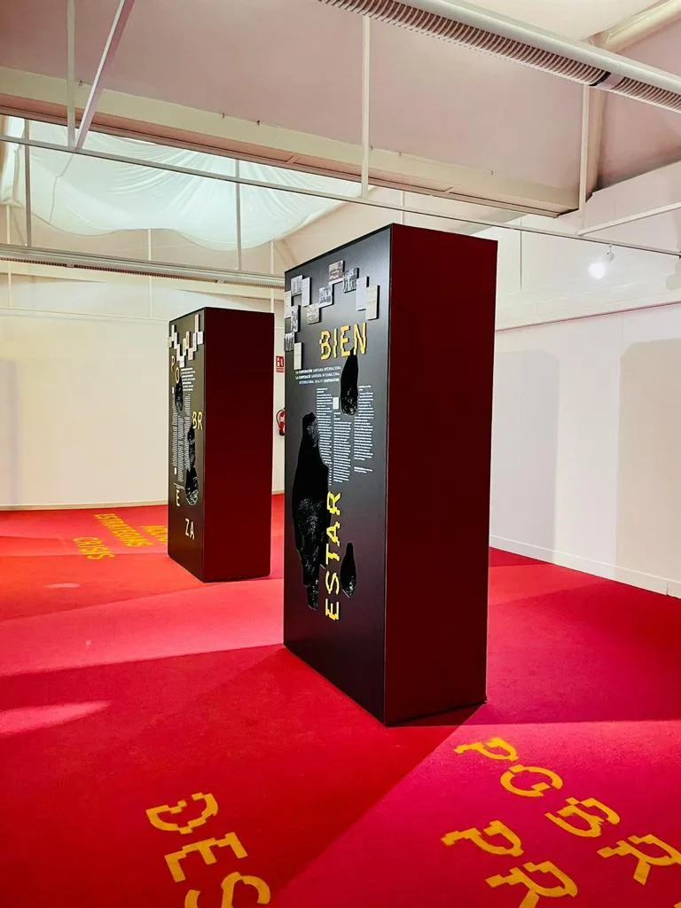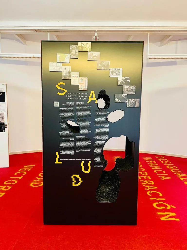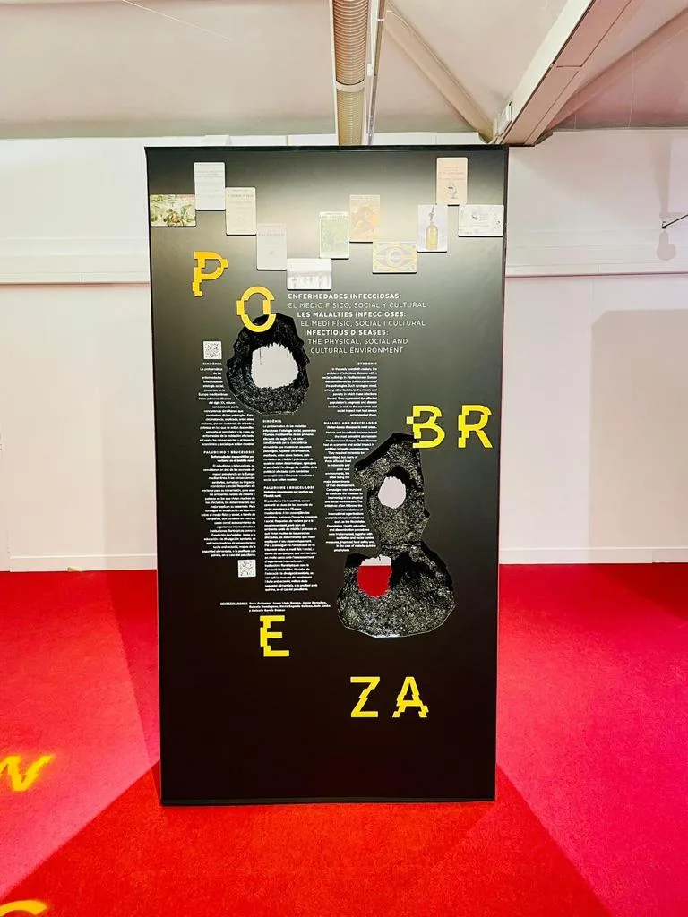 Con una sala de 110 metros y una economía contenida, se diseñó un soporte base que recoge el trasfondo científico a partir de un horadado informe y sinuoso, orgánico, que emula la enfermedad, la infección que avanza, sobre la limpieza de los paralelepípedos que sirven de soporte a la muestra. Los contenidos expositivos se adaptan a los espacios perdidos del soporte que, a partir del horadado, proponen miradas cruzadas a través de cada uno de los hitos. Estos cobran sentido en su conjunto e interconectados, donde la moqueta es otro plano de comunicación, ágil y efectivo.